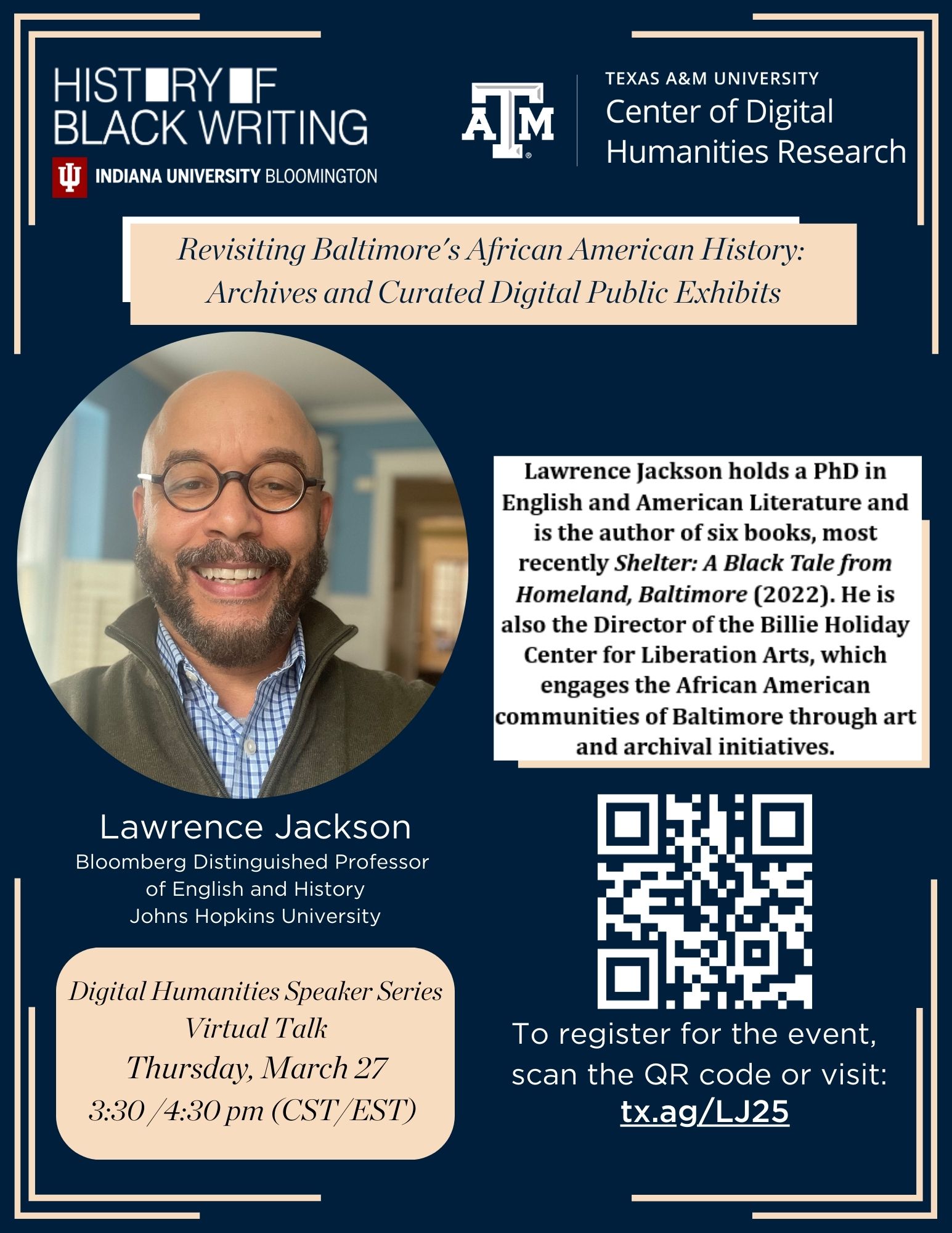 Virtual EventJoin the History of Black Writing (Indiana University-Bloomington) and the Center of Digital Humanities Research (Texas A&M University) for a virtual talk on March 27 at 3:30 PM CST / 4:30 PM EST. Dr. Lawrence Jackson, Bloomberg Distinguished Professor of English and History at Johns Hopkins University, will present "Revisiting Baltimore's African American History: Archives and Curated Digital Public Exhibits".